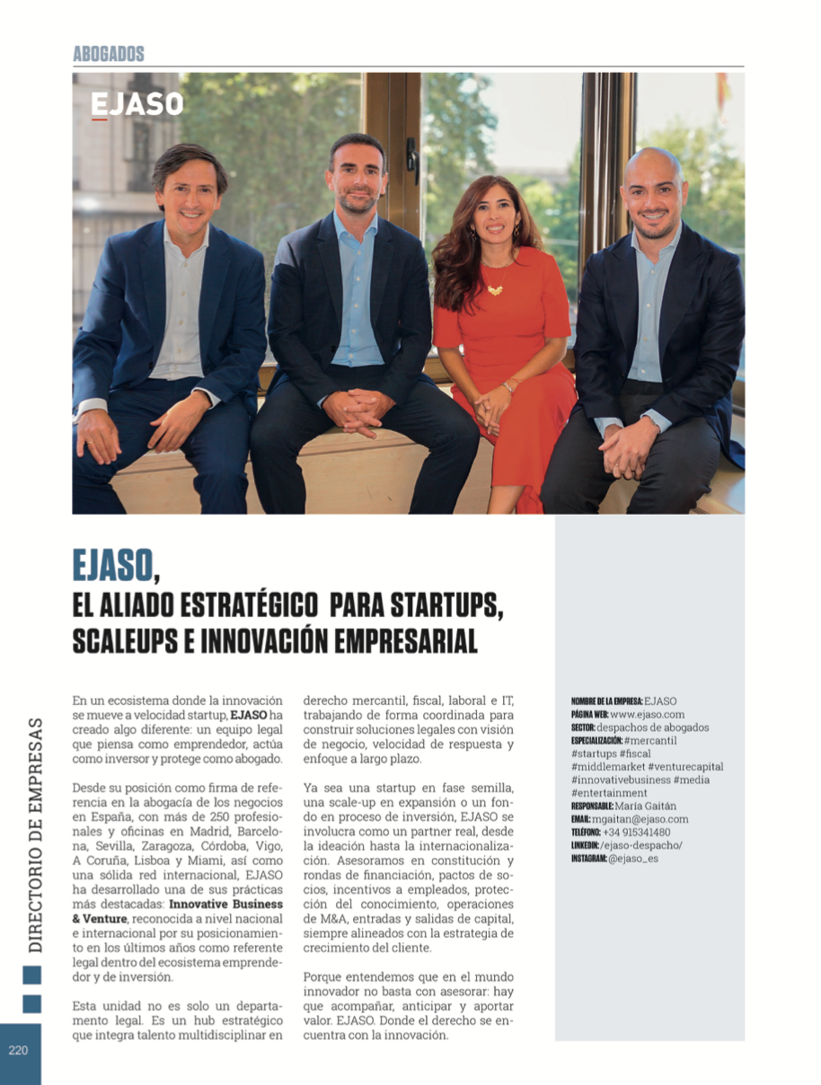 Un año más, EJASO forma parte de la Guía de Inversión para Startups elaborada por El Referente, una publicación clave dentro del ecosistema emprendedor nacional. En esta 10ª edición, nuestro equipo de Innovative Business & Venture Capital ha sido reconocido por su enfoque legal especializado, práctico y adaptado a las necesidades reales de las startups.